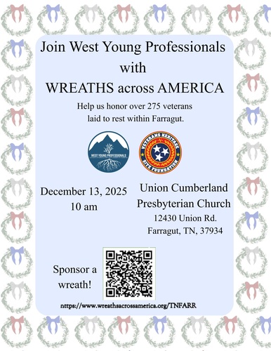The West YPs will be onsite at Union Cumberland Presbyterian Church in Farragut starting at 10:00 AM, working together until all wreaths are placed. Farragut holds its wreath-laying early so volunteers can also participate at noon at the main veteran cemeteries in Knoxville, a tradition many choose to continue.