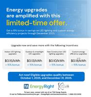 Upgrade your business’s energy efficiency and save more with TVA EnergyRight and LCUB’s limited-time incentive bonus! From October 1 to December 31, 2025, customers can earn an additional 15% bonus on savings for qualifying LED lighting and custom energy-efficiency upgrades. Whether you’re improving indoor or outdoor lighting, starting new construction, or pursuing custom efficiency projects, you can take advantage of incentives ranging from $0.10 to $0.18 per kWh. Don’t miss this chance to boost performance, lower energy costs, and make the most of your upgrades before the offer ends in December 2025.